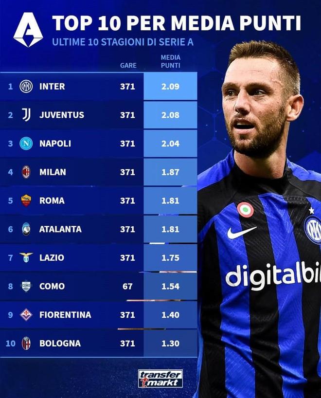 北京時間3月21日,德轉統計出了意甲近10年的場均積分排名,國際米蘭以2.09分位列第一,尤文圖斯2.08分第二,那不勒斯2.04分第三,AC米蘭1.87分第四。